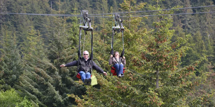 Enjoy sweeping views of scenic Chichagof Island as you soar 300 feet above the rain forest during a zip-line ride.
