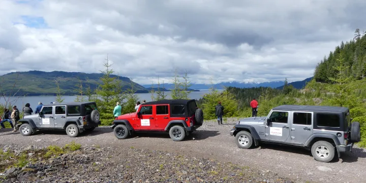 Take the road less traveled into the forests of Chichagof Island during an off-road drive in a 4x4 Jeep Wrangler.