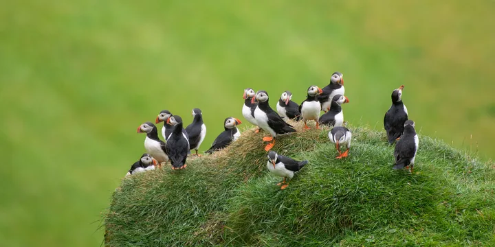Heimaey is the only populated island in the Westman Islands. The scenery is stunning with its volcanic landscapes, moss-covered clifftops and picturesque homes with brightly colored rooftops. A number of breathtaking natural sights are a result of the volcanic eruption that took place here in 1973, which saw the evacuation of all 5,000 residents to the mainland. Each summer, millions of puffins pay a visit and countless other species migrate here to feed and breed. Several efforts are underway to protect the wealth of wildlife, from puffins to the gentle giants of the sea.