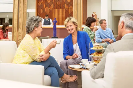 The two women and a dog walk toward the camera into an ornately carved library. Two gilt chairs with red upholstery are in a corner with a table and vintage standing lamp in between the chairs.
